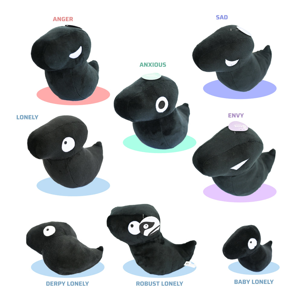 Anger Plush, Sad Plush, Anxious Plush, Lonely Plush, Envy Plush, Derpy Lonely Plush, Robust Lonely Plush, and Baby Lonely Plush.